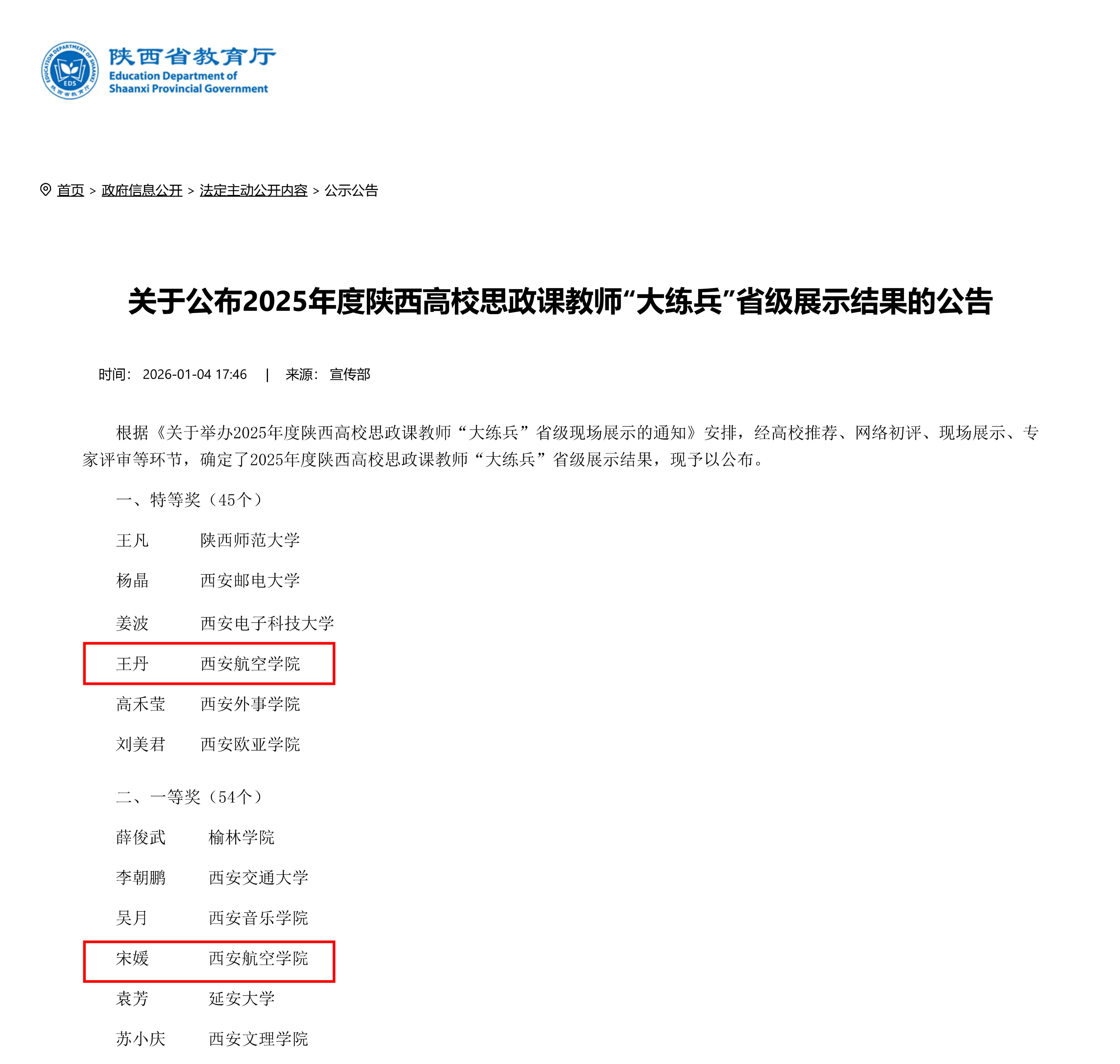 近日,中共陕西省委教育工委、陕西省教育厅公布了2025年度陕西高校思政课教师“大练兵”省级展示活动评选结果。我校马克思主义学院教师王丹荣获特等奖、宋媛荣获一等奖,这是我校思政课教师在该项赛事改革后首次斩获特等奖。