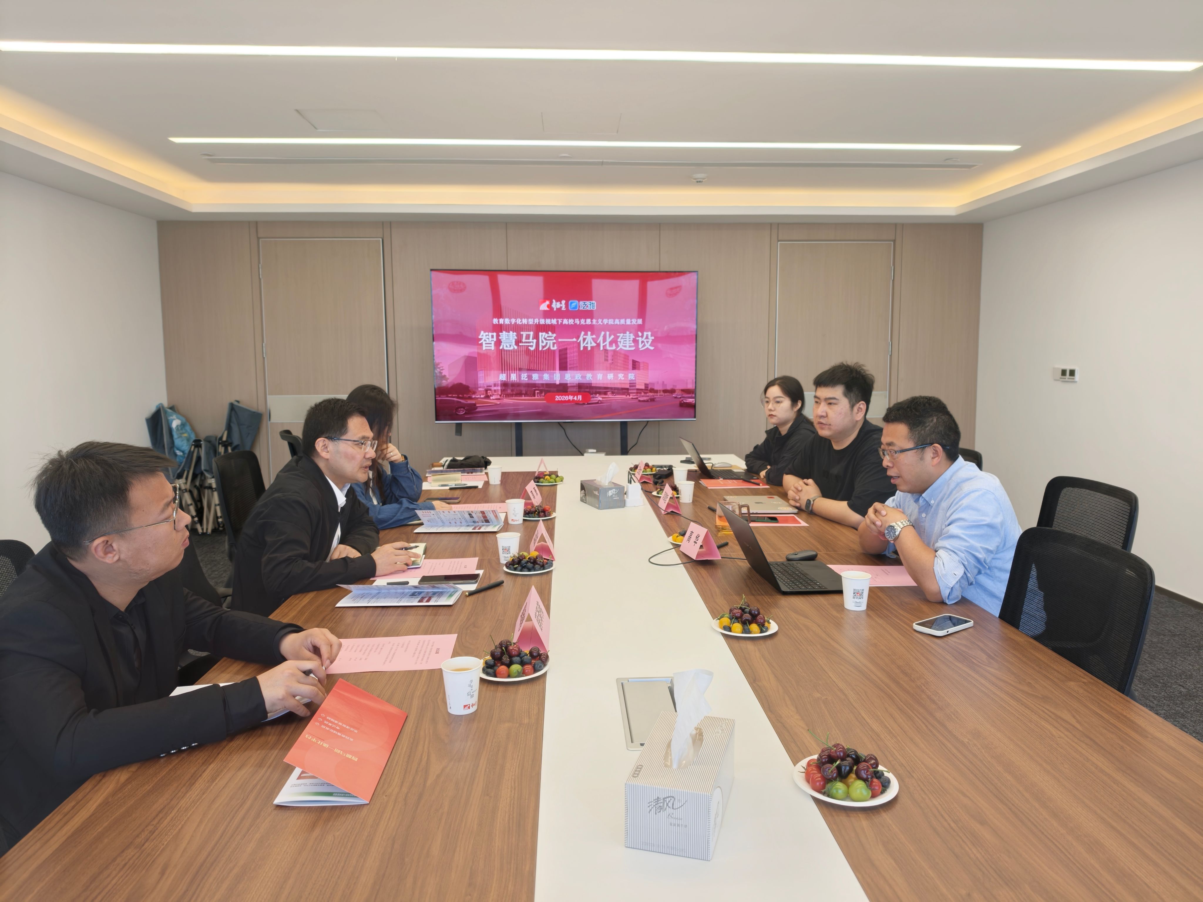 座谈会上,超星集团西安分公司项目经理从平台与资源建设、理论与实践教学、线下空间等方面介绍了公司的“智慧马院一体化建设”情况与成功案例;超星集团西安研究院院长高华对王国成一行表示欢迎,详细介绍了公司的“云犀OS平台”等,他表示,希望双方充分发挥优势,为学院思政教育教学改革和数字化建设赋能。王国成简要介绍了学院学科建设、教学改革等情况,从航空精神融入思政课建设、陕西红色资源共享、VR资源嵌入线下空间建设等方面提出构想,希望未来加强合作交流,加快智慧马院建设。双方围绕人工智能赋能思政教育教学、数智思政实验室场景应用等内容进行深入交流与探讨。